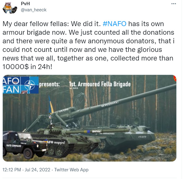 (The Jeep is labeled "NAFO command", the tank has "NAFO near" and "BONK", and the self-propelled howitzer has "NAFO", "SUPERBONK", and "NO NONSENSE".)
