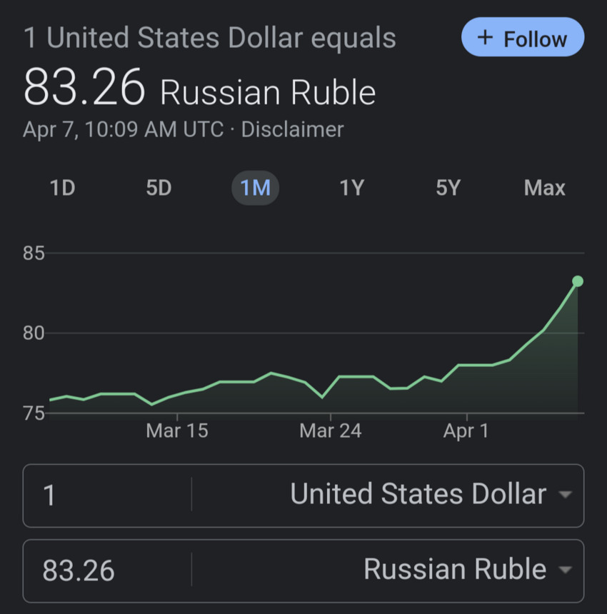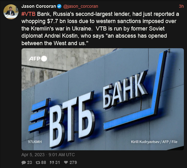 nitter link about a Russian bank taking a huge loss due to Western sanctions.