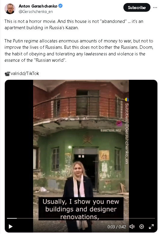 The house is not abandoned, it's an apartment building in Russia's Kazan. Video showing what regular Russians put up with.