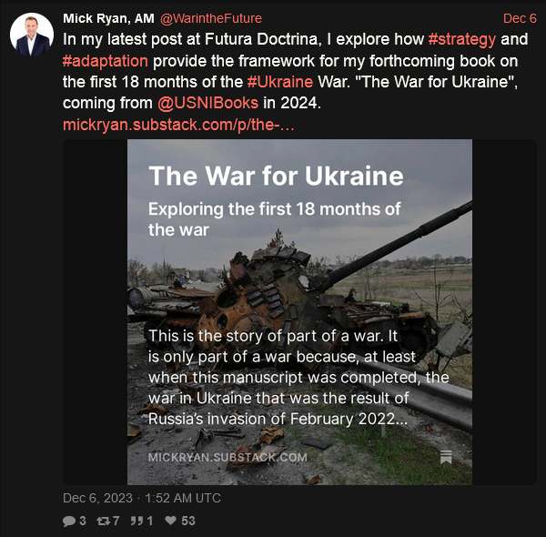 substack link where Mick Ryan's writing a book about the Ukraine war.
