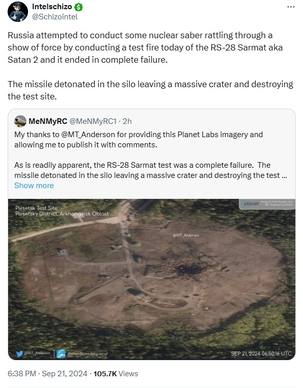 Russia conducted a test of an RS-28 Sarmat missile, and the missile exploded in the silo.