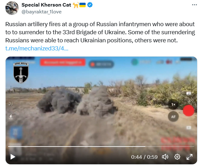 Russian artillery fires on a group of Russian infantrymen who were about to surrender.