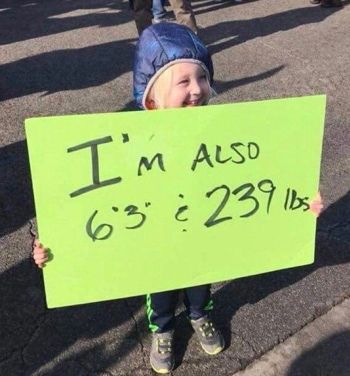 Protest sign from Saturday, small child claims to also be 6'3" and 239 pounds.