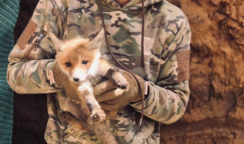 Ukrainian soldiers with a fox cub.